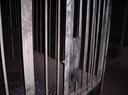 A very dark basement area with cages